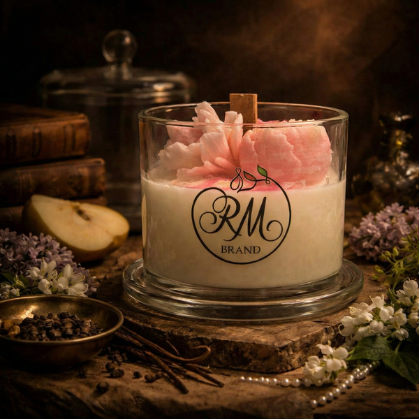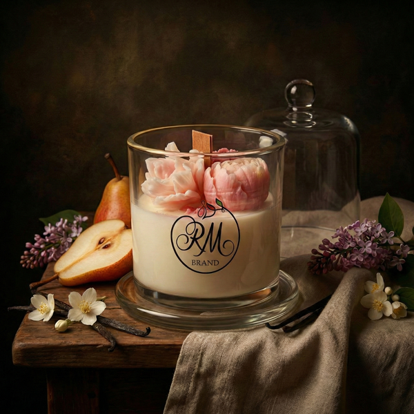 Свеча с куполом и восковыми цветами. Эффект живого огня, натуральный цветочный аромат и деревянный фитиль.